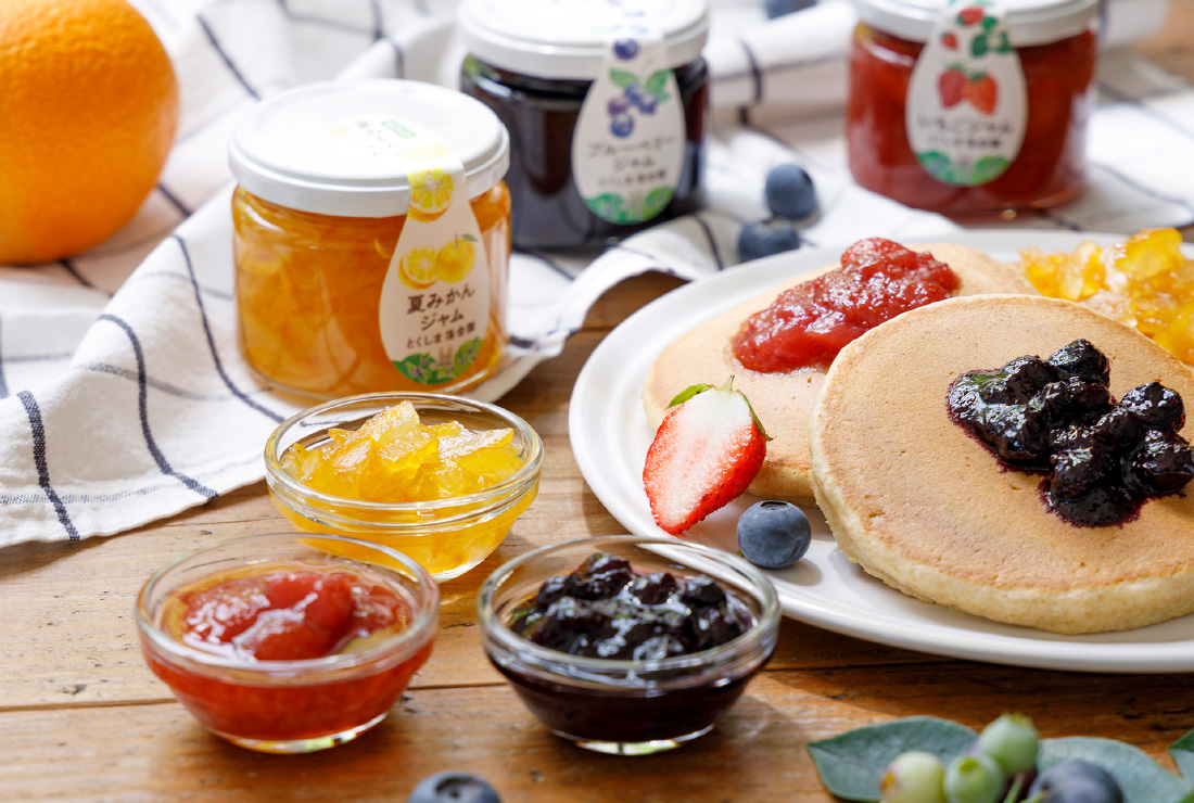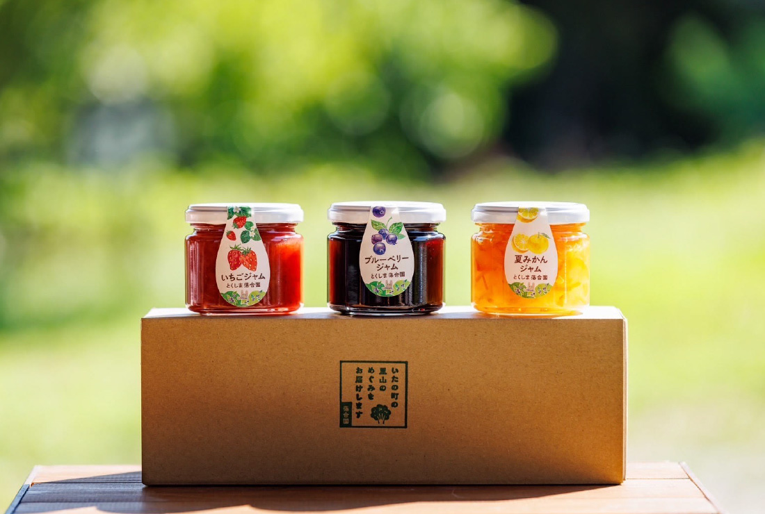 落合ブルーベリー園や地元板野町で育った季節の果実を使って、小さな工房でひとつひとつ園主が手づくりしたジャムです。保存料・ペクチン無添加で、ゴロゴロとした果実感あふれる素朴な味わいです。