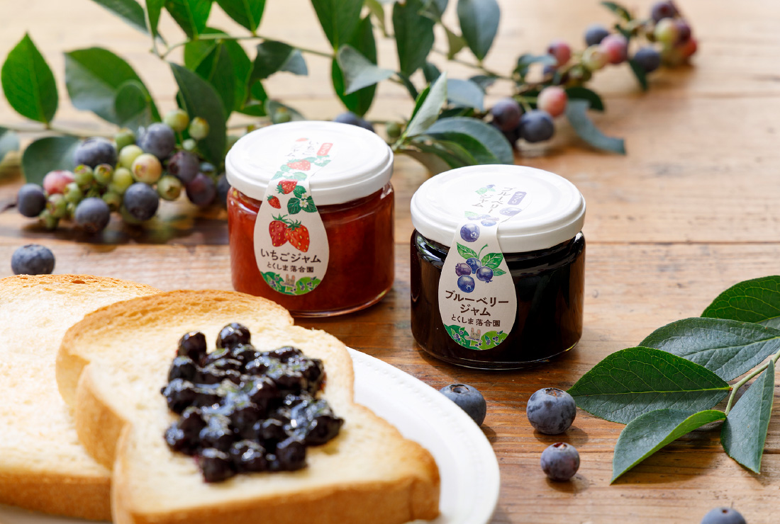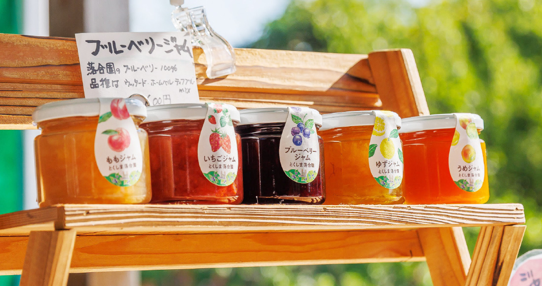 ジャム用の果実は主に期間中農薬不使用で自家栽培したものを使用。ももやいちごなども板野町の顔が見える農家さんから取り寄せています。夏にはブルーベリー狩りの観光農園も人気です。