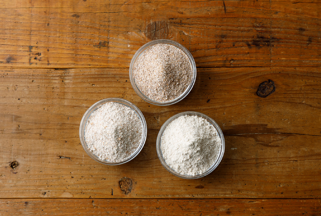 少し粒感を残した「小麦粉」、ザクザク食感に仕上がる「全粒粉」、食物繊維たっぷりの「ふすま(ブラン)」どれも安心して楽しめるのは栽培期間中農薬不使用で育てた小麦だからこそ。