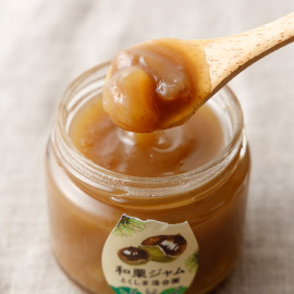 落合ブルーベリー園の栽培期間中農薬不使用の栗を使っています。なめらかな栗のペーストの中に残った粒がおいしい。そのままスプーンですくって食べちゃう人もいる期間限定の人気ジャムです。