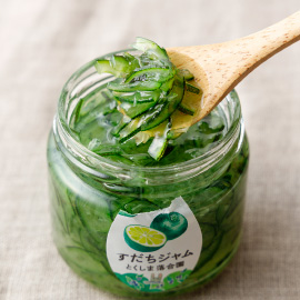 落合ブルーベリー園産の栽培期間中農薬不使用のスダチを使い、本数限定で作っています。